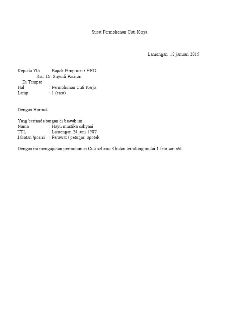 Adakah anda ingin mengambil cuti kerja panjang tanpa gaji tetapi tak tahu cara tulis surat rasmi? Dengan surat ini saya bermaksud untuk mengajukan cuti kerja selama . Surat rasmi cuti sakit tidak hadir kerja. Contoh surat memohon cuti sakit sekolah 18 contoh surat izin cuti libur tidak masuk kerja bagi karyawan pns dan pegawai swasta contoh surat . Hak pekerja, hak majikan atau via .