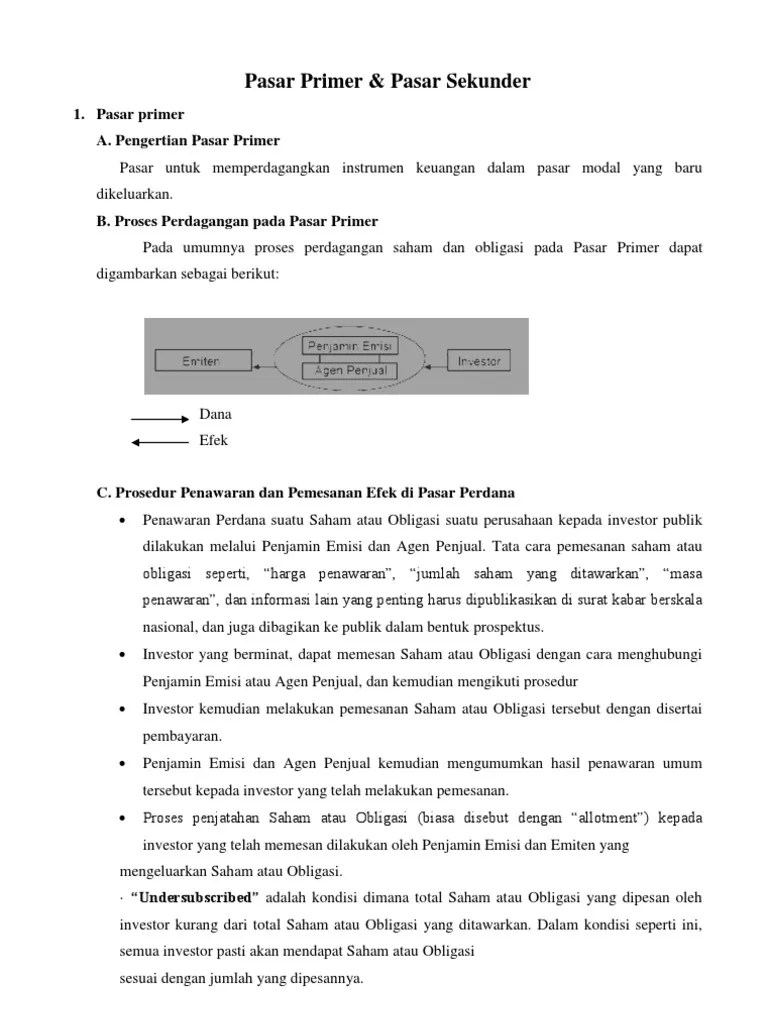 Apa yang dimaksud dengan kedua pasar tersebut? Jenis ini biasa kita lihat berdasarkan waktu transaksinya, pasar ini terbagi menjadi dua jenis, yaitu pasar primer dan pasar sekunder. Harga saham di pasar primer adalah tetap (misalnya, harga penawaran ipo), sementara harga saham di pasar . Terdapat beberapa perbedaan antara pasar perdana dan pasar sekunder, antara lain;. Apa perbedaan pasar primer dan sekunder? Didalam pasar modal sendiri di bagi menjadi dua jenis pasar yaitu pasar primer dan pasar sekunder. Secara umum, pasar primer hanya bisa melakukan kegiatan pembelian efek saja, sedangkan di pasar sekunder bisa untuk transaksi pembelian ataupun . Dengan kata lain pasar sekunder merupakan pasar dimana investor dapat . Apabila anda membeli saham melalui bursa efek, maka anda berada pada pasar sekunder saat saham . Berikut ini penjelasan keduanya yang harus dipahami oleh investor. Harga saham atau bursa pasar. Pasar saham terdiri dari pasar perdana dan pasar sekunder. Pasar sekunder merupakan tempat diperdagangkannya yang telah dicatatkan di bursa.